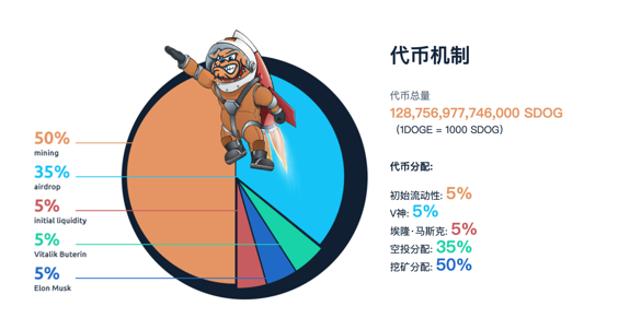 小狗币的总发行量为128,756,977,746,000 SDOG SDOG(1DOGE = 1000 SDOG)。代币分配机制如下,5%为初始流动,35%为空投,其中5%空投将给V神,5%空投给马斯克,50%用于挖矿。