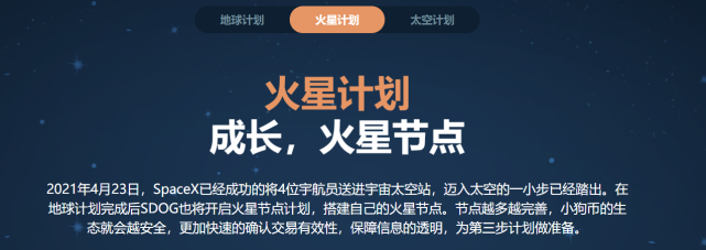 2021年4月23日,SpaceX已经成功将4位宇航员送进宇宙太空站,迈入太空的一小步已经踏出。在地球计划完成后SDOG也将开启火星节点计划,搭建自己的火星节点。节点越多越完善,小狗币的生态就会越安全,更加快速的确认交易有效性,保障信息的透明,为第三步计划做准备。